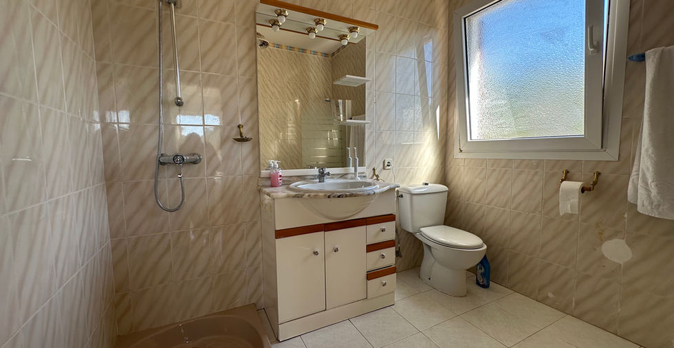 Amplia terraza con vistas abiertas, Chimenea y techos con vigas vistas, Apartamento de invitados con entrada independiente, Parcela soleada con posibilidad de piscina, Estilo mediterráneo con mucho potencial, Aparcamiento exterior para 2 coches, Ubicación tranquila y a pasos de la playa